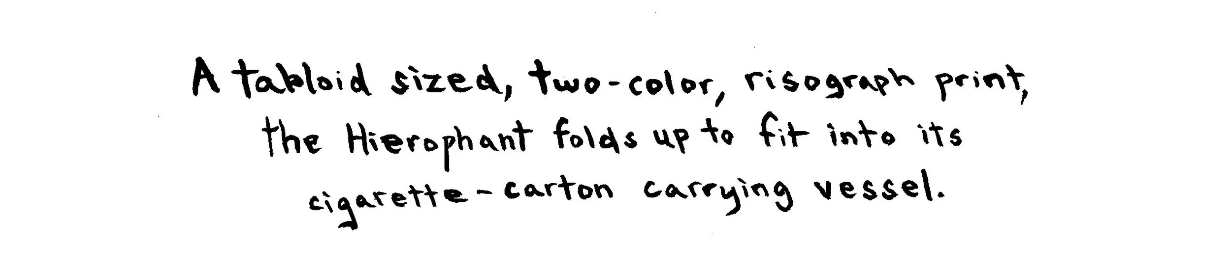 A tabloid sized, two-color, risograph print, The Hierophant folds up to fit into a cigarette-carton carrying vessel. The cartons are hand assembled after being laser-cut and laser-etched with a variety of symbols.